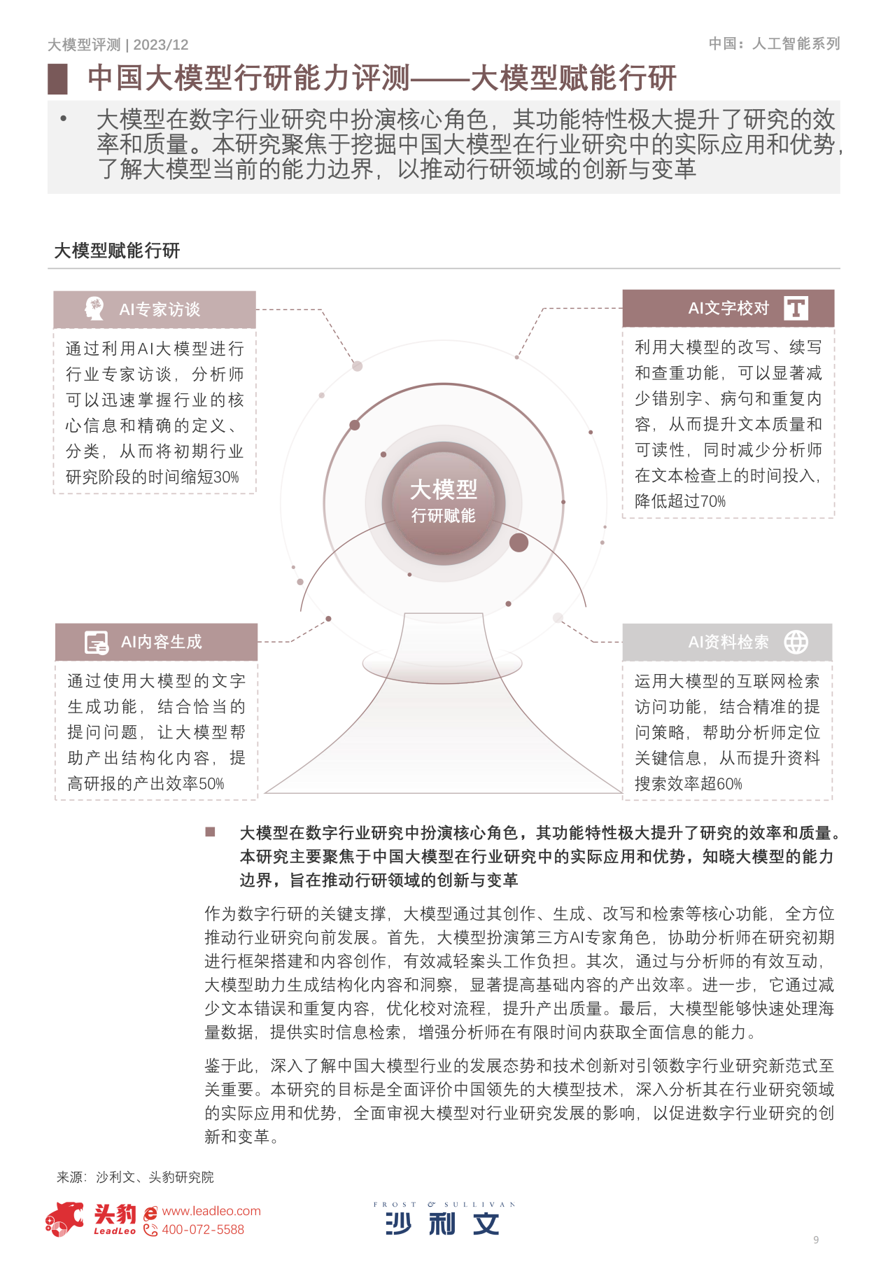 为全面了解中国大模型在行业研究领域的应用表现,沙利文调动了百人规模的分析师,从研究报告撰写能力、模型基础能力、行业综合理解能力三大核心板块对大模型进行了多维度的综合评估。
