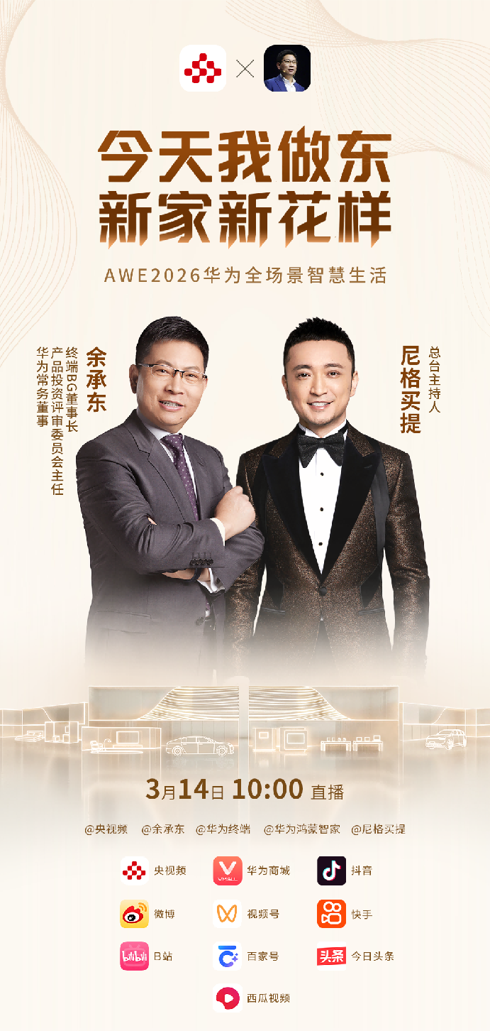 2025年3月14日,华为常务董事、产品投资评审委员会主任、终端BG董事长余承东将携手央视主持人尼格买提共同探展华为全场景展区并开启直播,请持续关注华为终端官方及央视频直播信息!华为诚邀您莅临上海新国际博览中心W4馆,亲身感受华为全场景展区空间智能新形态,深度体验无缝协同的智慧生态新居所。