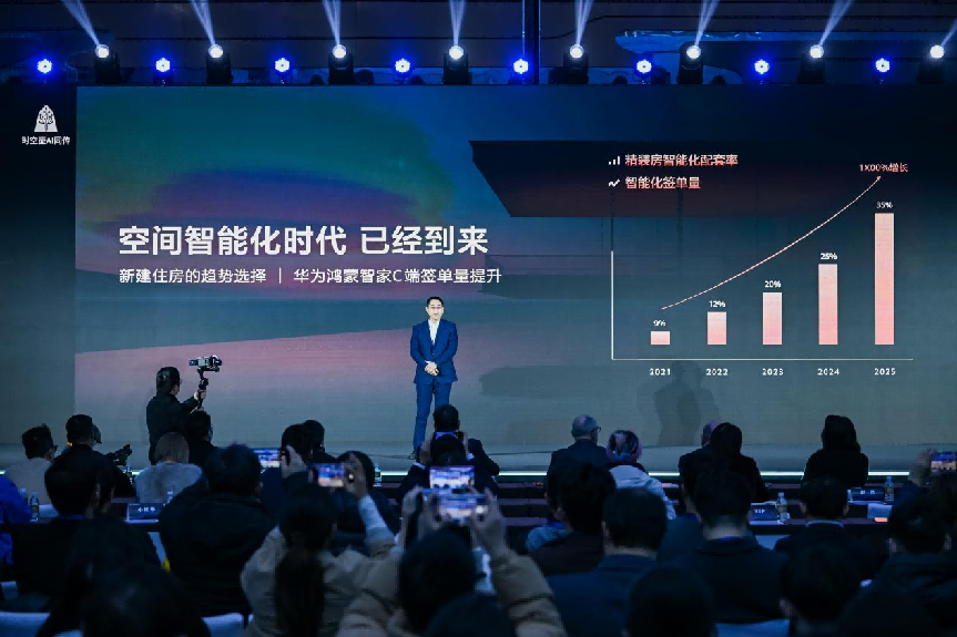 智能家居行业正迎来规模化普及的黄金时期。闵登峰在演讲中披露,过去五年国内住宅精装修市场的智能化覆盖率从 2021 年的 9% 飙升至 2025 年的 35%,高端住宅更是达到 60%-90% 的超高覆盖率,即便在房地产市场波动期,智能化趋势依然逆势上扬。华为鸿蒙智家自 2021 年入局以来,终端零售门店四年增长十余倍,根据奥维云网数据,2025 年 1-10 月其在国内精装房智能化领域斩获断层式第一的成绩,成为行业增长的核心引擎。