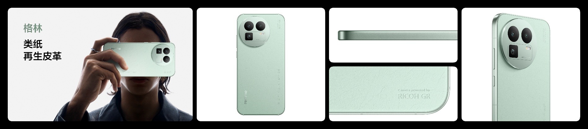 除了颠覆性的Deco设计创新,真我GT8 Pro机身上每一处细节都彰显出旗舰质感。采用全新AG工艺的“怀特”,机身整体纯白素雅,材质是触感如丝般顺滑的AG磨砂玻璃。蓝色的“布鲁”和绿色的“格林”,则是全新的类纸再生皮革,其基底由回收的纸张与涤纶制成,使得每一台真我GT8 Pro呈现出独一无二的天然纹理,并具备亲肤耐磨、轻薄、耐腐蚀等特性,配合坚固的哑光金属中框与流线型大R角,共同打造温润贴合的握持手感。