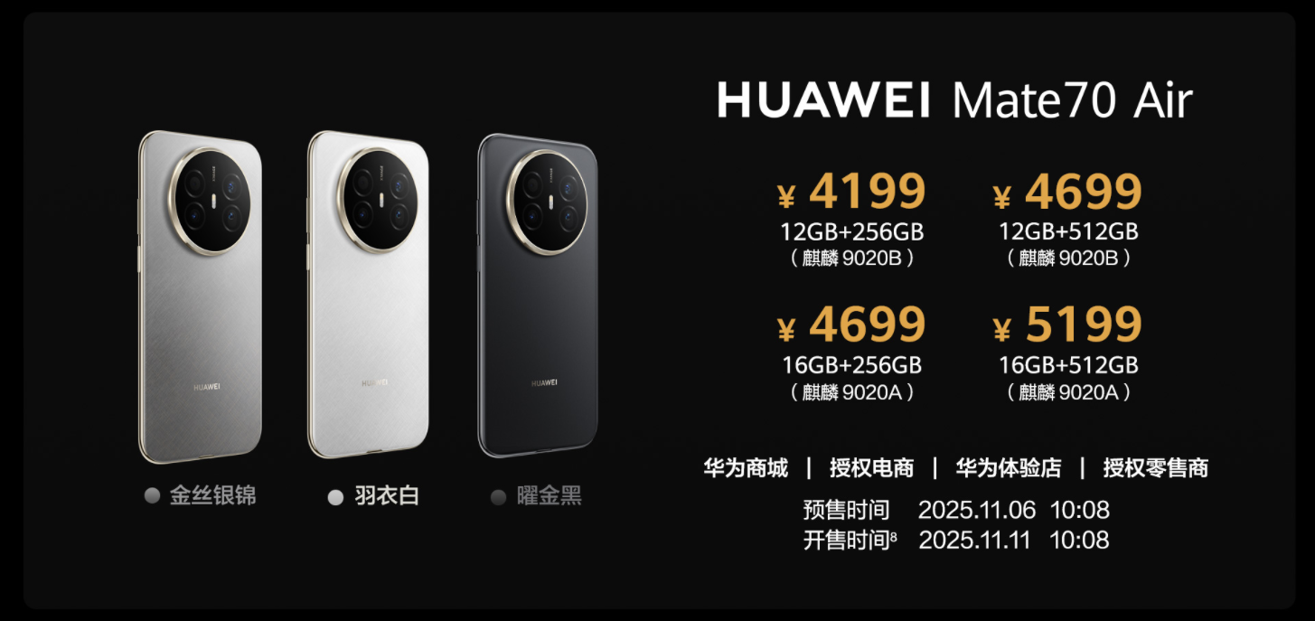 11月6日10:08,华为Mate 70 Air正式开启预售,4199元起的价格策略与6.6mm超薄机身设计,标志着华为在高端市场再次突破技术边界。
