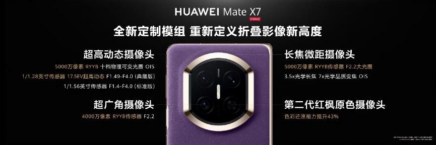 MateX7背板首次采用传承1600年的云锦技艺,通过纳米纤维材质打造出云锦白、云锦蓝两款配色,寰宇红、幻影紫、曜石黑三款素皮版本则彰显奢华质感。摄像头模组的“时空之门”设计语言,重构未来美学范式。