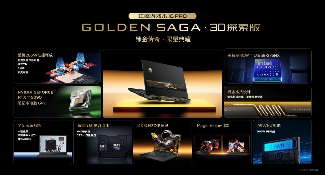在游戏本上,红魔游戏本16 Pro全新升级GOLDEN SAGA·3D探索版,搭载英伟达5090显卡,拥有64GB+2TB存储,并且首次在笔记本上带来了流金水冷设计。