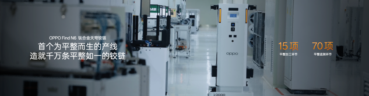 「新一代钛合金天穹铰链」,率先打破传统精密加工的极限。铰链采用行业首个仿生对称四轴结构,相较传统三轴铰链,扭力提升 20% 的同时,让铰链表面起伏从 0.18 mm 降至 0.1 mm,支撑面更广、受力更均匀,开合手感丝滑如一。但 0.1 mm 的起伏依然不够,OPPO 追求的是极致的平整。为此,OPPO 开创性地将芯片领域的精密加工技术应用于铰链制造,带来行业首创「芯片级高分子 3D 打印技术」,让铰链中板平整度至高提升 75% ,将微观天堑化为坦途。OPPO 更打造了行业首个专为平整而生的产线,让每一台 Find N6 的铰链都拥有极致统一的平整表现。
