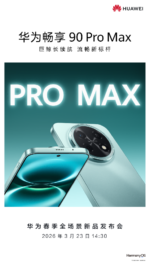 近日,华为终端正式官宣华为春季全场景新品发布会预热海报,同步释放华为畅享 90 Pro Max与华为畅享 90 Plus两款新品的核心产品信息,宣告华为畅享 90系列将重磅登陆本次春季新品发布会。随着产品外观设计、核心配置等关键信息陆续释出,新机在长续航、流畅度等维度的全面升级引发行业与消费者的高度关注,也让这场定档 3 月 23 日的新品发布会收获了更多期待。