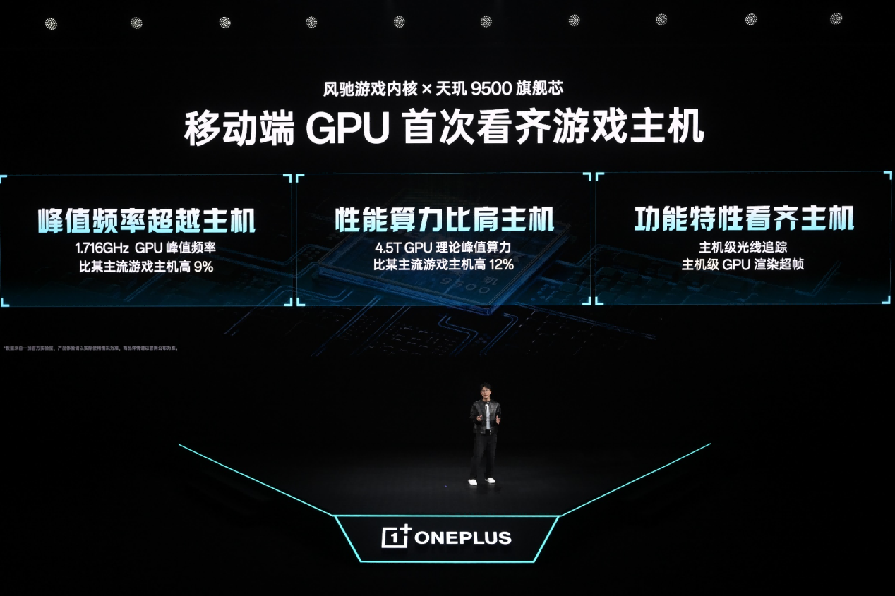 但与常规旗舰不同的是,一加为这颗旗舰芯出厂写入了自主研发的新一代「风驰游戏内核」。通过芯片底层的架构重构与优化,一加彻底释放了天玑 9500 的硬件潜力,更实现了移动端 GPU 性能首次看齐游戏主机:GPU 峰值频率达到 1.716GHz,较主流游戏主机高出 9%;4.5T 的 GPU 理论峰值算力,超出主流游戏主机 12%,同时支持主机级光线追踪与 GPU 渲染超帧,把主机级的渲染能力真正带到了移动端。